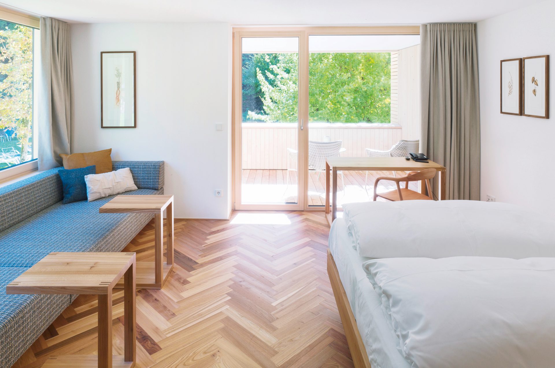 Genießen Sie luxuriöse Entspannung im Herzen der Natur. Unser neues Gartenzimmer Premium bietet Ihnen exklusiven Komfort mit direktem Zugang zum Sky SPA, Garten SPA mit Außensauna, Fitnessraum, Hallenbad & Naturbadesee sowie das Krone Ferienprogramm (Aktivkurse, geführte Wanderungen, Konzerte, Dorfspaziergang).