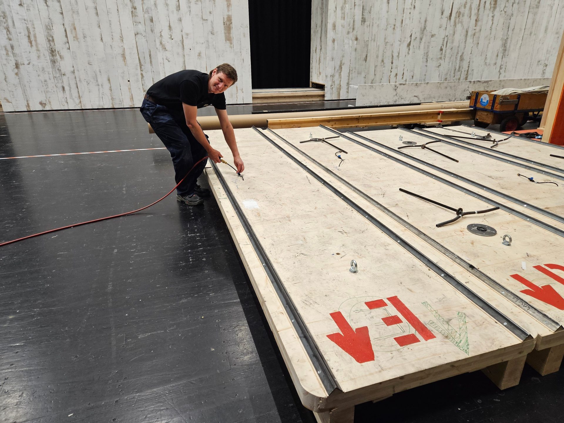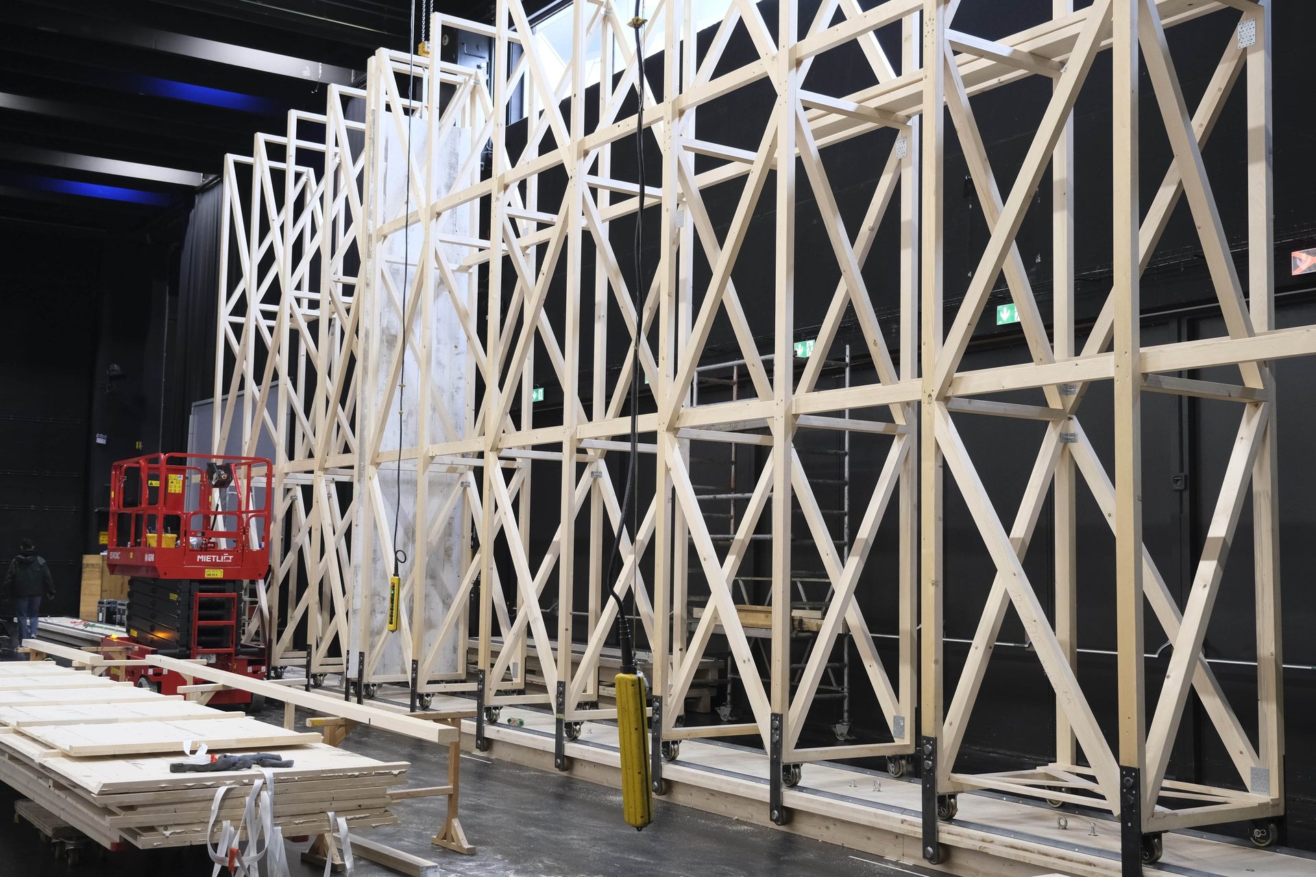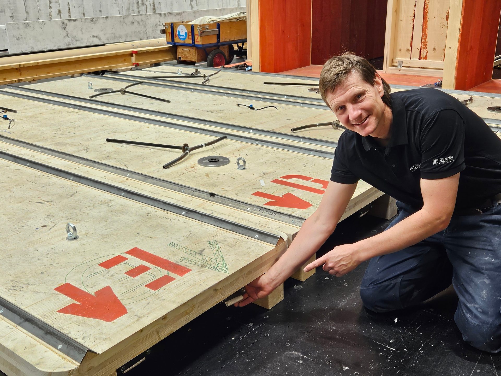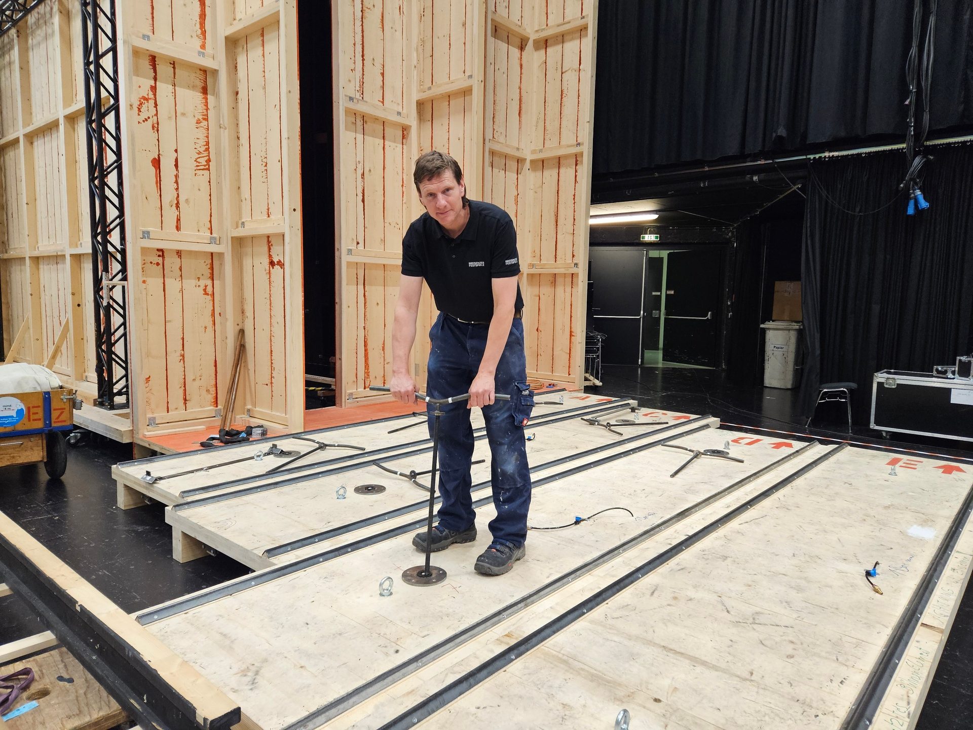 Über 4.500 Stunden Arbeitszeit stecken im Bühnenbild von Œdipe, das aus über 35 Elementen und 280 Quadratmeter Holzbrettern aus Vorarlberg zusammengebaut wurde. Spätestens bei der Generalprobe sieht Jürgen, wie das Bühnenbild in Action aussieht und wirkt. Darauf freut er sich schon besonders, wenn er seinen Job erledigt hat, er das Schauspiel genießen kann und die anderen am Zug sind.