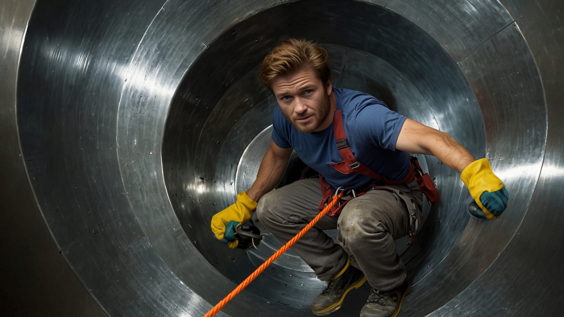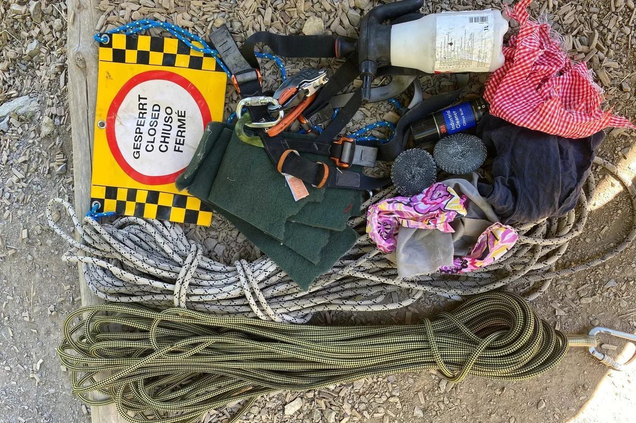 „Aber warum braucht ihr Seile?“, fragt Felix weiter. Martin zeigt auf die Sicherung: „Wir müssen uns in der Rutsche festmachen, damit wir nicht abrutschen. Deshalb haben wir Kletterausrüstung, Knieschoner und sogar ein Abseilgerät dabei. Und weil wir alles mitnehmen müssen – von Putzmittel bis Schwämme – packen wir lieber zu viel ein. Wenn etwas runterfällt, müssen wir sonst die ganze Rutsche wieder hoch.“