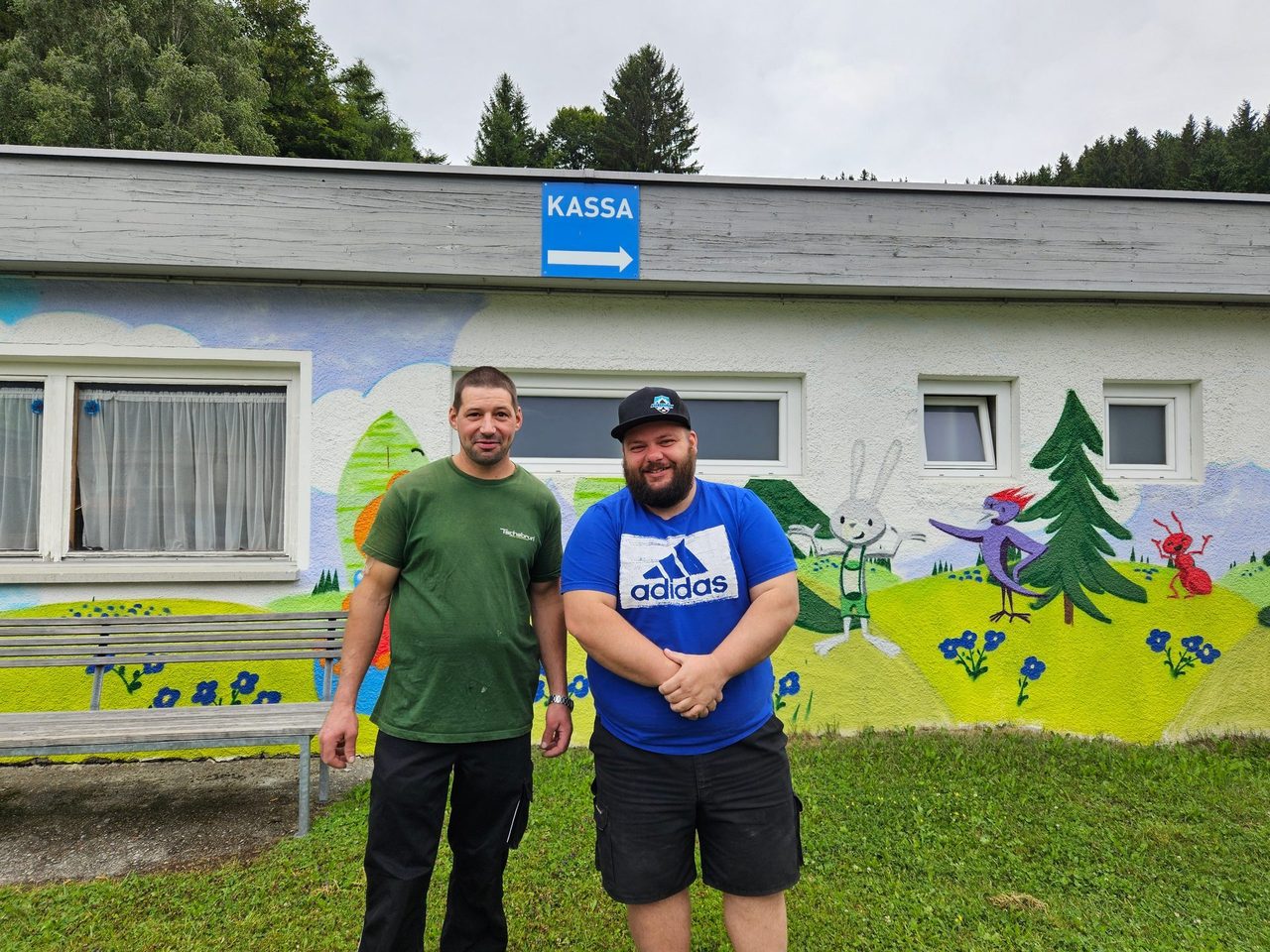 Während sie auf das bestellte Essen warten, treffen sie auf Manuel und Philipp, die gerade Mittagspause machen. Die beiden Mädchen fragen neugierig, warum sie so großes Werkzeug dabeihaben. „Wir kommen gerade von den neuen Wanderwegen und haben geschaut, ob alles passt“, erzählt Manuel und Philipp ergänzt, „Habt ihr Freschi den Frosch und seine Freunde schon auf der Klangreise durch den Wald begleitet?“
