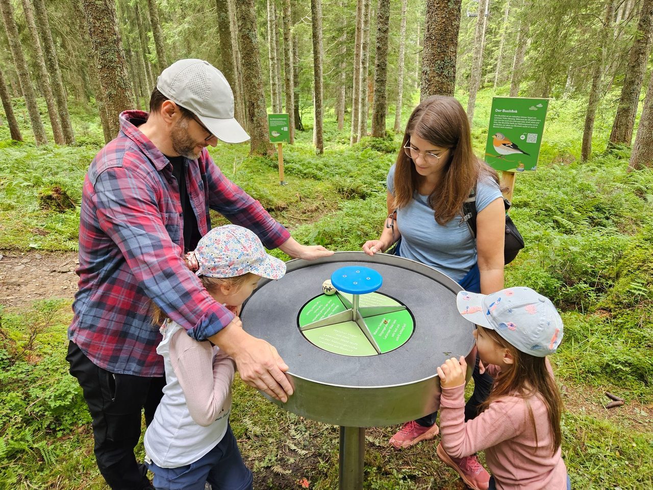 Apropos Waldboden, darum geht es auch bei der nächsten Station. „Wusstet ihr, dass es im Wald auch Geräusche unter der Erde gibt?“, fragt Papa Toni und die Mädchen lauschen gespannt, was er vorliest: „Das Kriechen von Würmern und Insekten, das Rascheln von Blättern oder kleinen Tieren, wenn sie sich am Boden bewegen – all diese Geräusche sind leise, aber wichtig, da sie Teil des natürlichen Kreislaufs sind.“ Außerdem, erklärt er, helfen die Tiere im Boden, die Erde zu lockern und Nährstoffe zu zersetzen. So unterstützen sie das Wachstum der Pflanzen. Mit so viel neuem Wissen versuchen sich die vier am Kugel-Drehspiel. Der Plan: Das Glöckchen soll klingeln. Und während die drei älteren der Familie noch das Glöckchen zum Ertönen bringen wollen, zieht es Theresa bereits weiter.