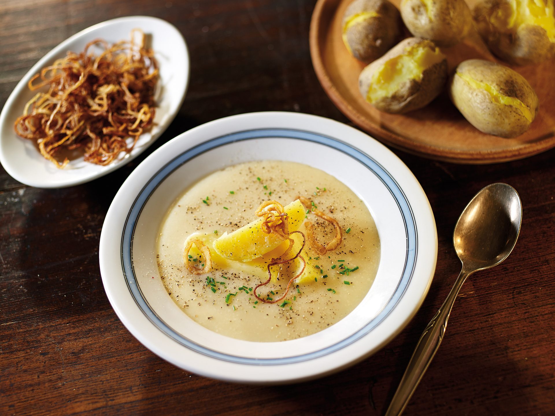 Die gekochten Kartoffeln schälen, klein schneiden und in den Suppenteller geben, die Suppe einfüllen und mit Röstzwiebeln und Schnittlauch garniert servieren.