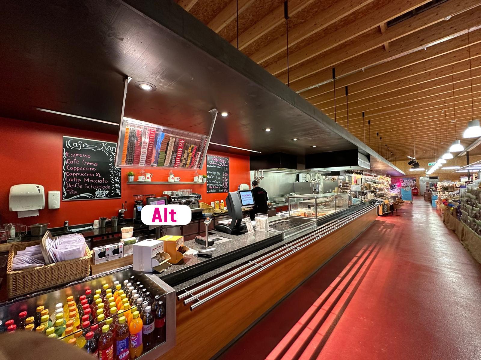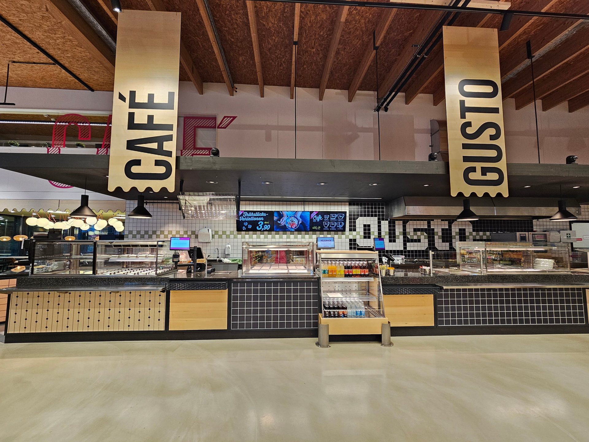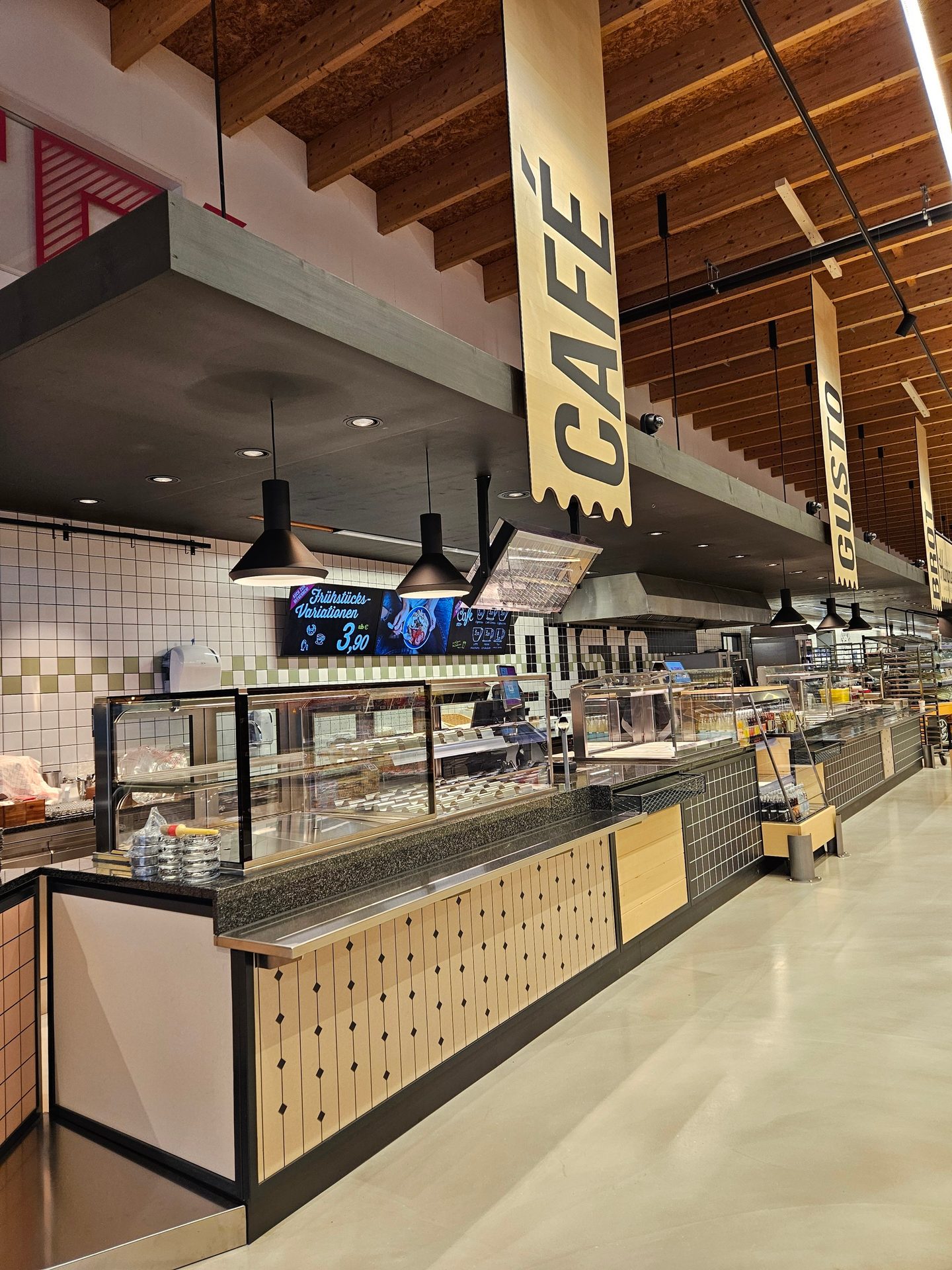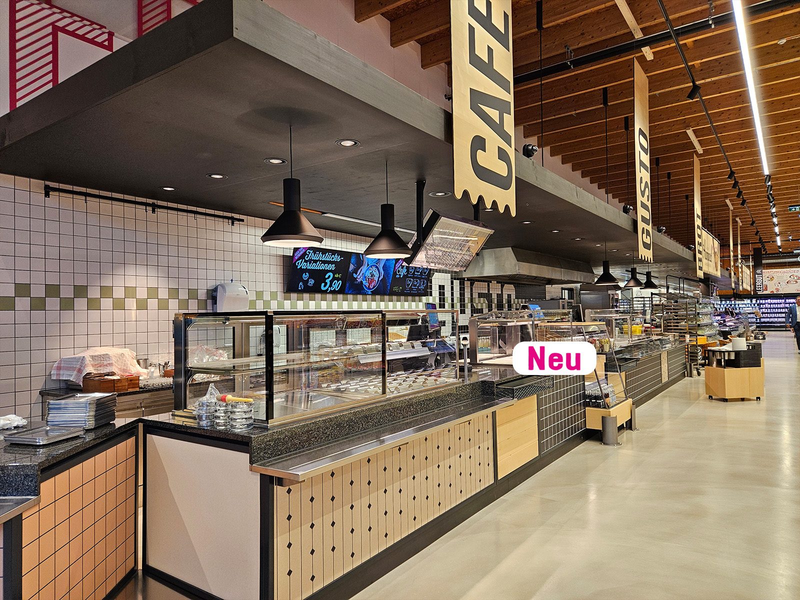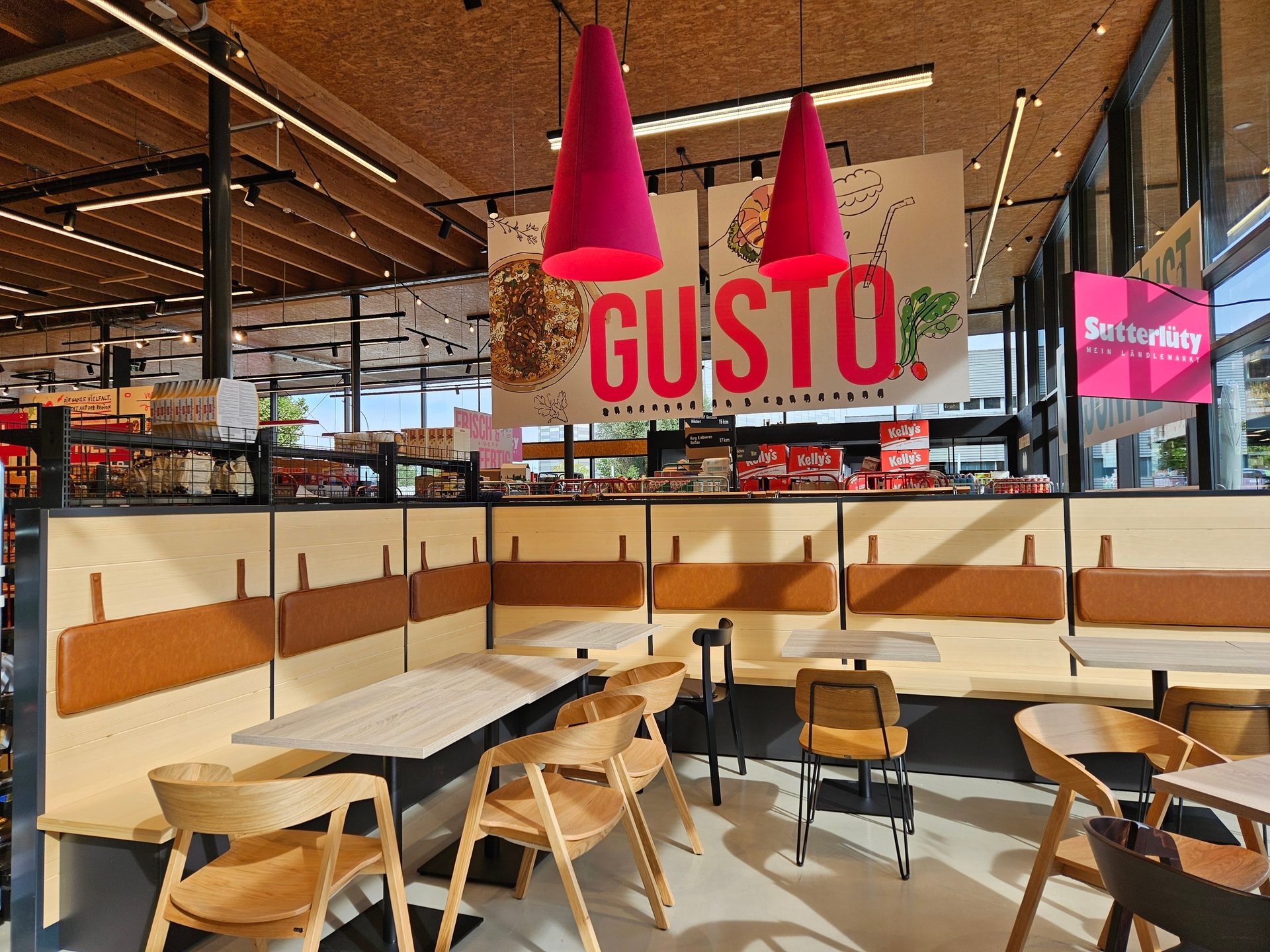 Während es vorher eher Kantinenflair ausstrahlte, gibt es nach dem Umbau ein komplett neues Konzept. Ein Gusto, das zum Verweilen und Genießen einlädt. Eine Holzwand sorgt für eine klare Abtrennung zwischen Gusto und Einkaufsfläche und ein langer Holztisch in der Mitte sorgt für ein Gefühl von Gemeinschaft – hier darf man sich dazusetzen, ins Gespräch kommen oder einfach gemeinsam schweigen und genießen.
