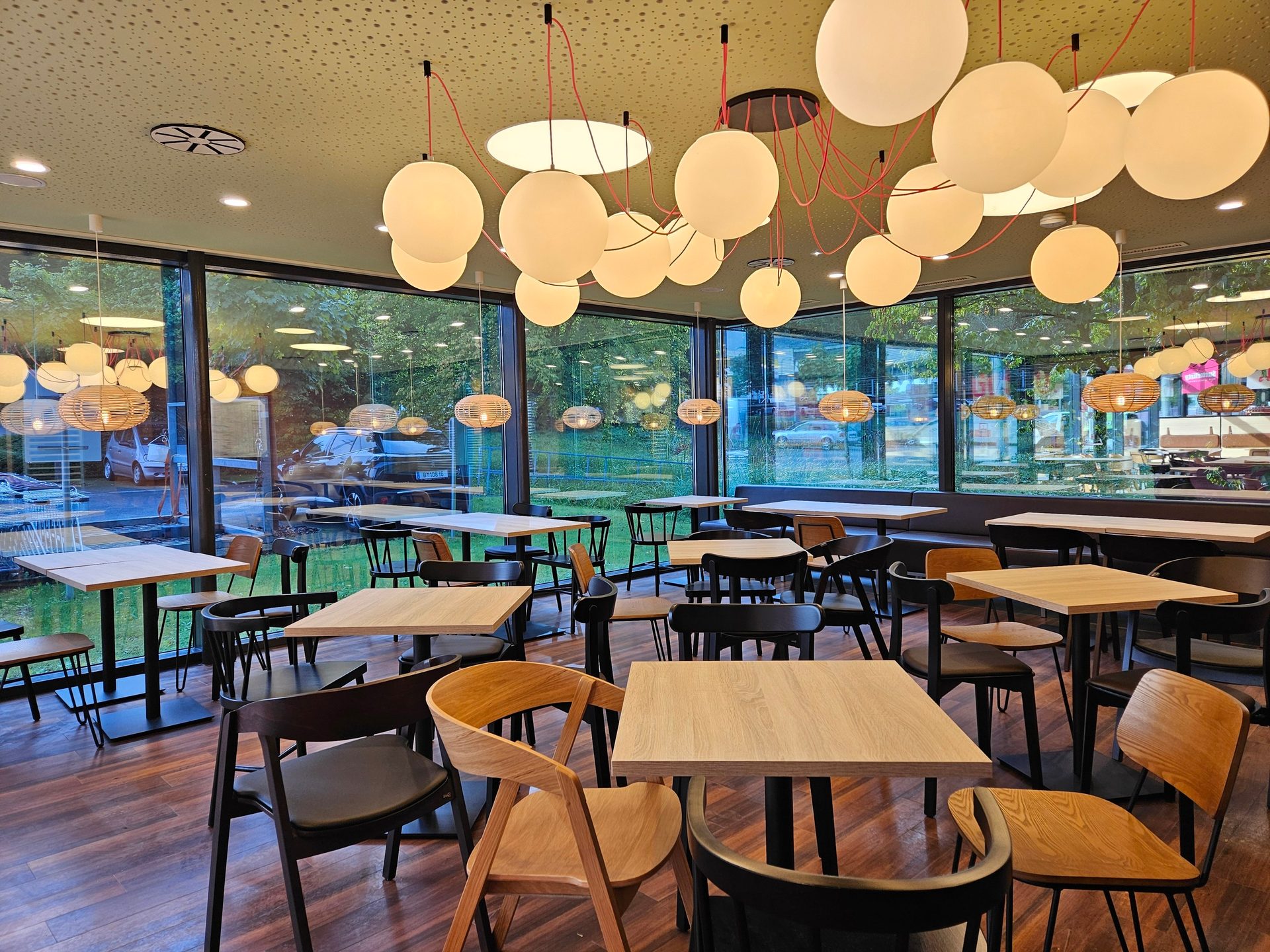 Neben dem Sitzkonzept wurde auch das Beleuchtungskonzept individuell entwickelt: verspielte Lampen setzen lebendige Akzente und schaffen eine Wohlfühlatmosphäre. Die Geräte sind auf dem neuesten Stand der Technik, beispielsweise kühlen die Kühlgeräte von nun an mit Sole, was umweltfreundlicher ist.